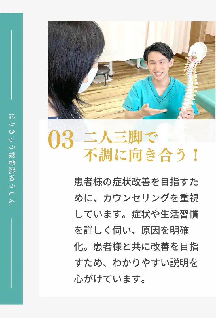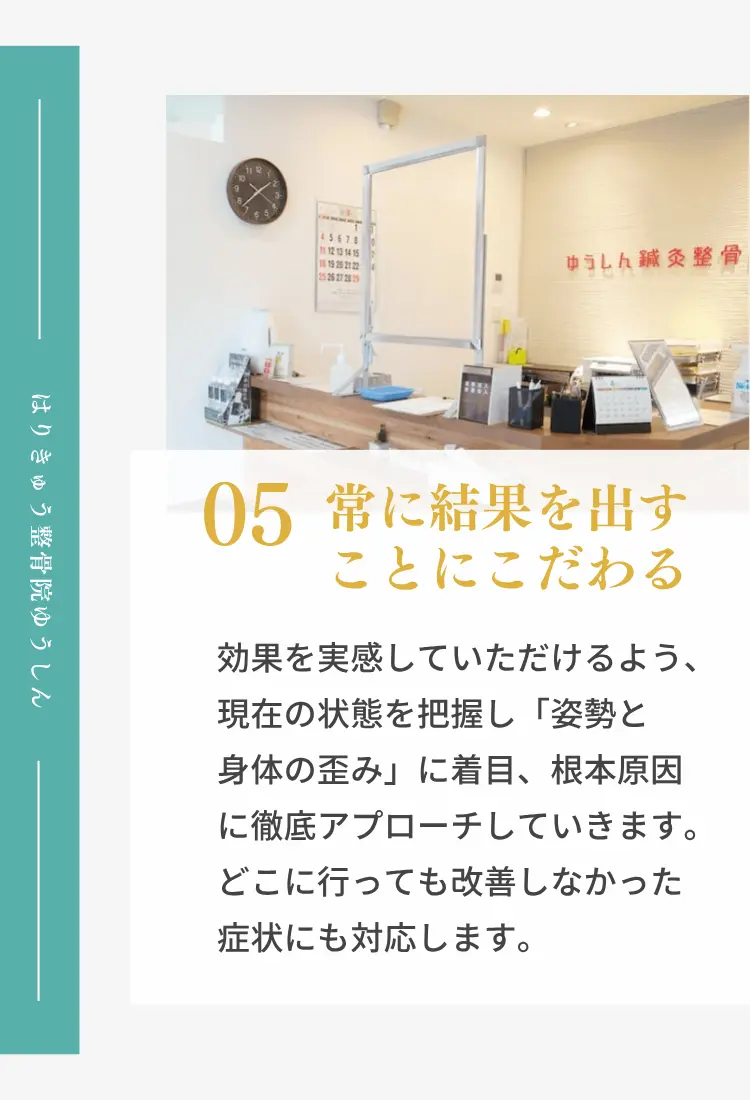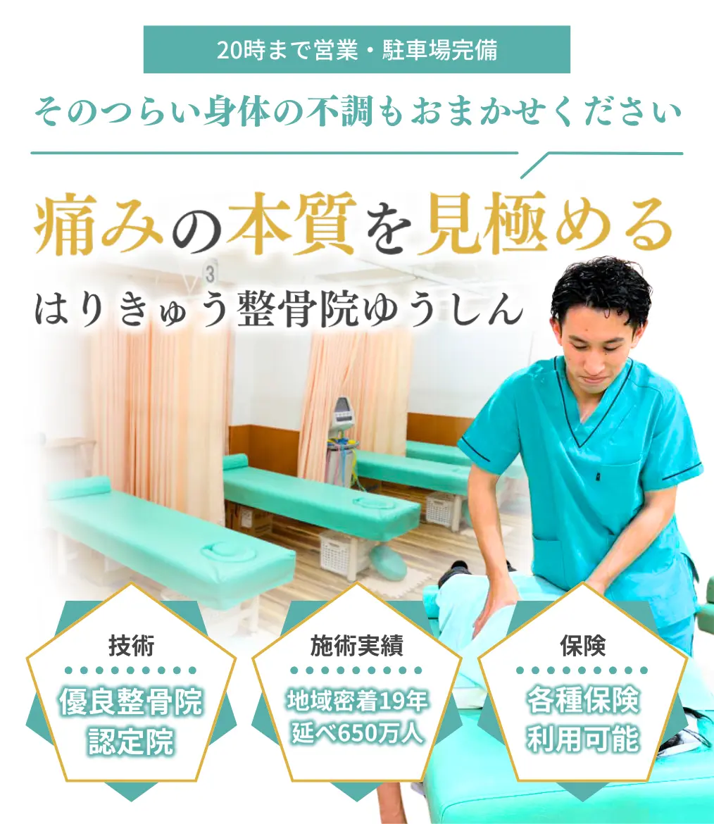 院名 はりきゅう整骨院 ゆうしん 所在地 〒063-0801 北海道札幌市西区二十四軒1条4-3-12 電話番号 011-590-1866 営業時間 月〜金 9:00~12:00 / 15:00~20:00 土祝 9:00~18:00 休診日 日曜日 駐車場 あり/3台 Googleマップ